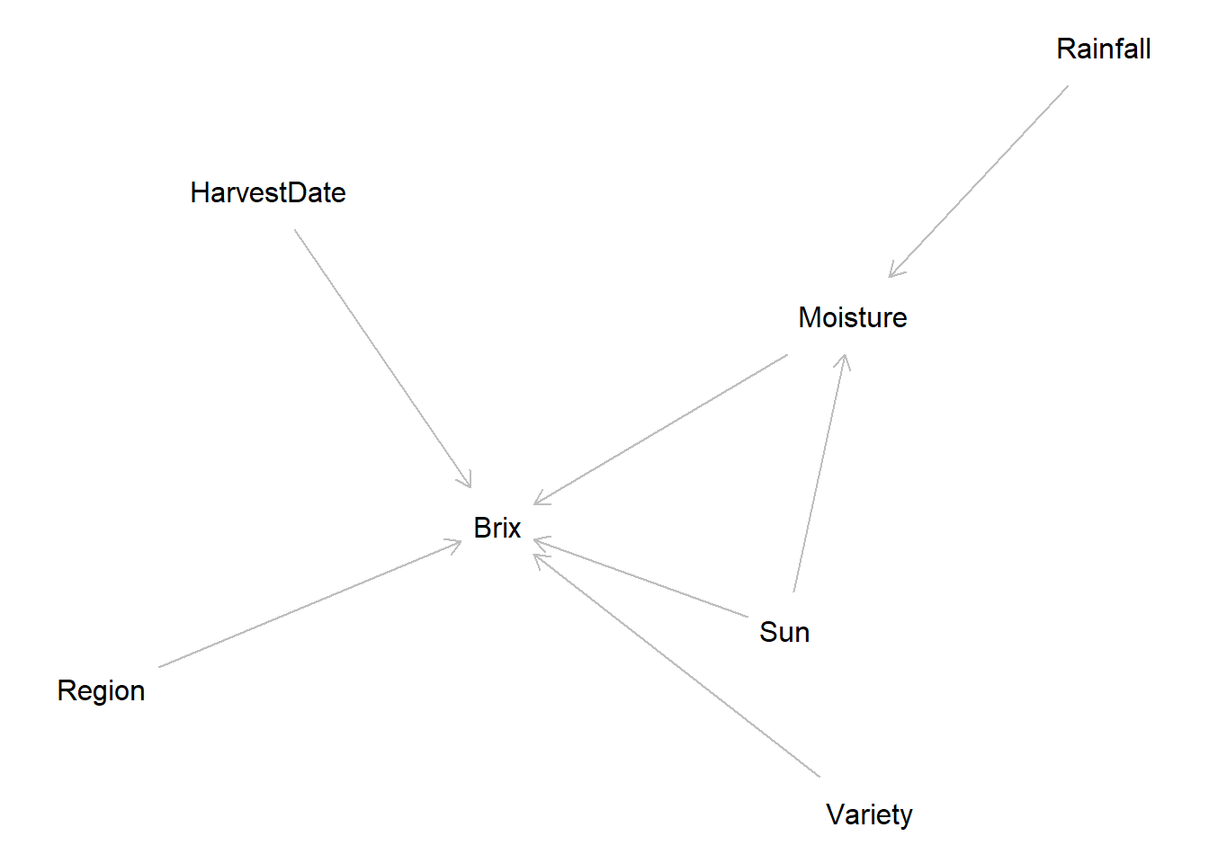We specify a DAG to represent our assumed causal relationships between predictors and Brix