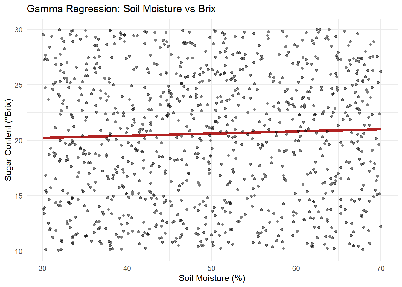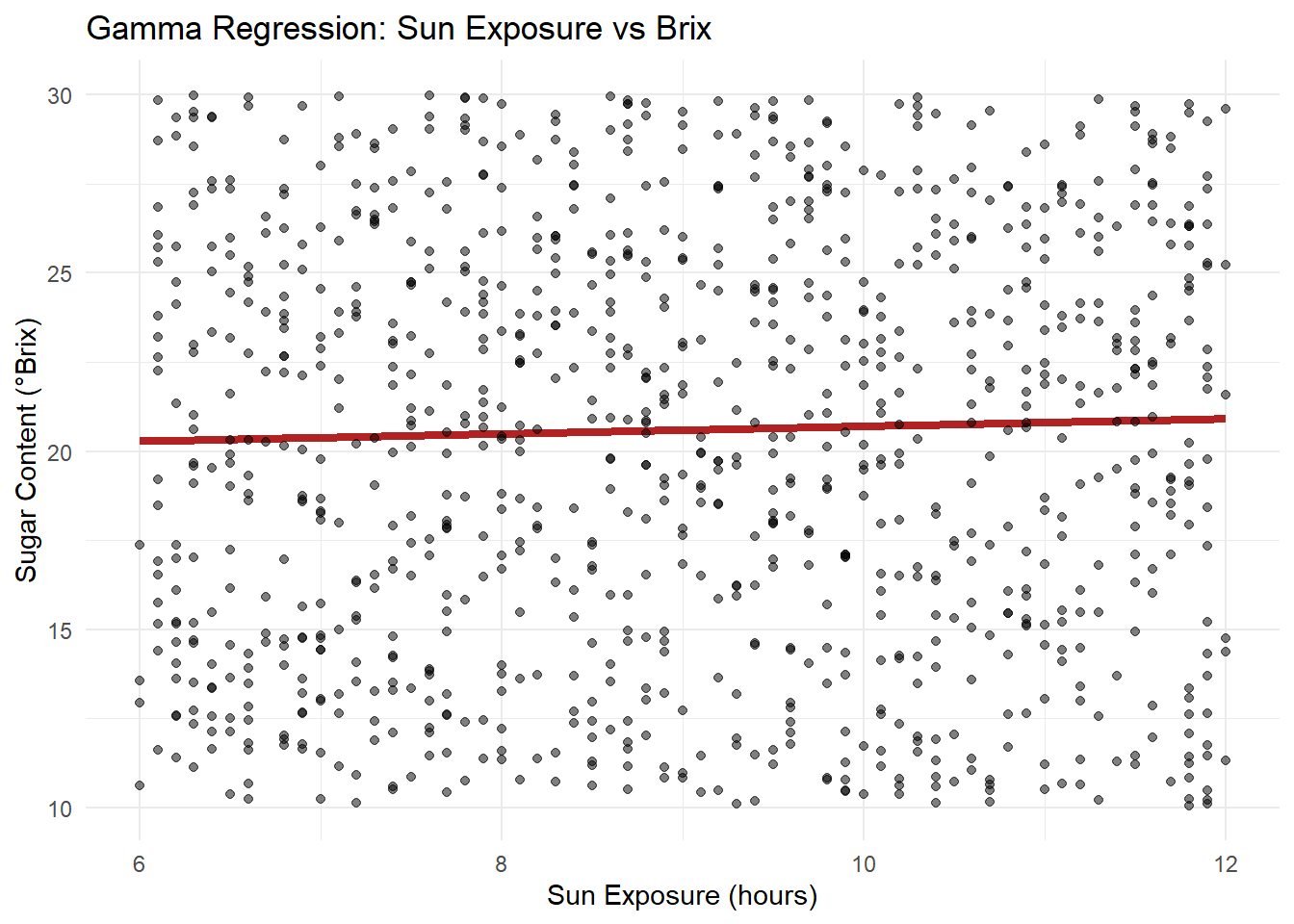 The Gamma regression model recovered true parameters when tested. In the real data, the predictors showed low correlations (no multicollinearity). However, the model could explain very little of the variation of Brix, suggesting other environmental or physiological factors may be more influential in Brix.