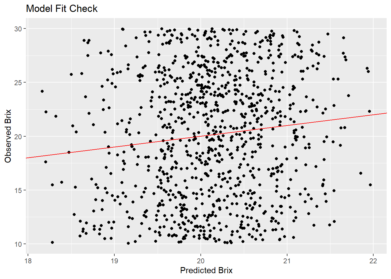 labs(x = "Predicted Brix", y = "Observed Brix", title = "Model Fit Check")