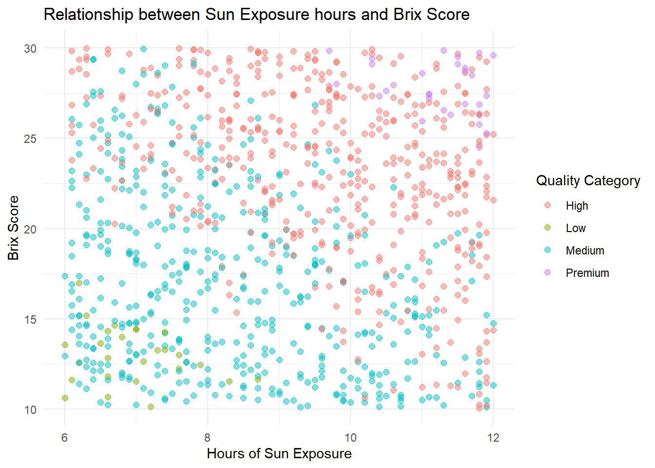 title = "Relationship between Sun Exposure hours and Brix Score",
