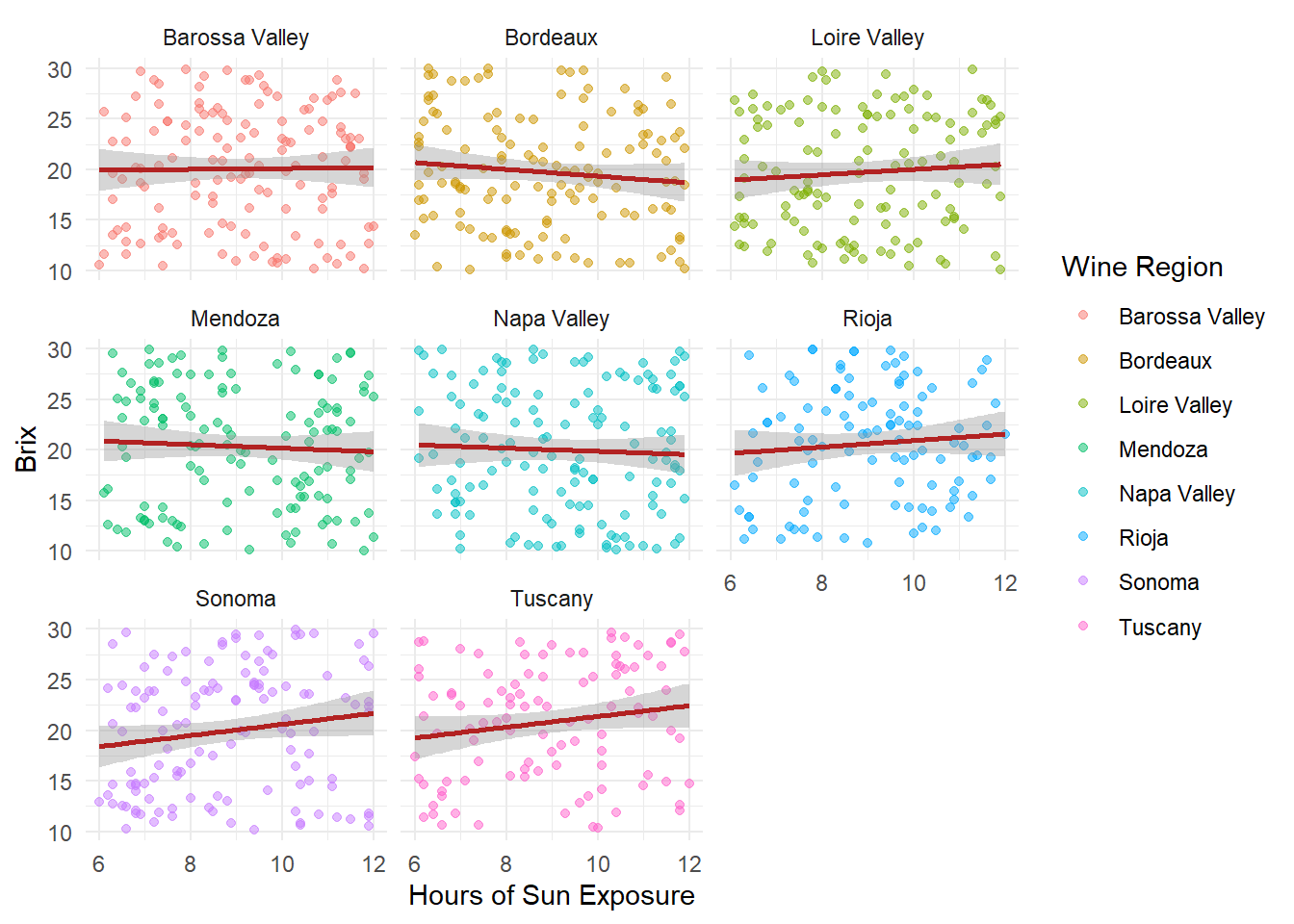 ggplot(grapes, aes(x = sun_exposure_hours, y = sugar_content_brix, color = region)) +