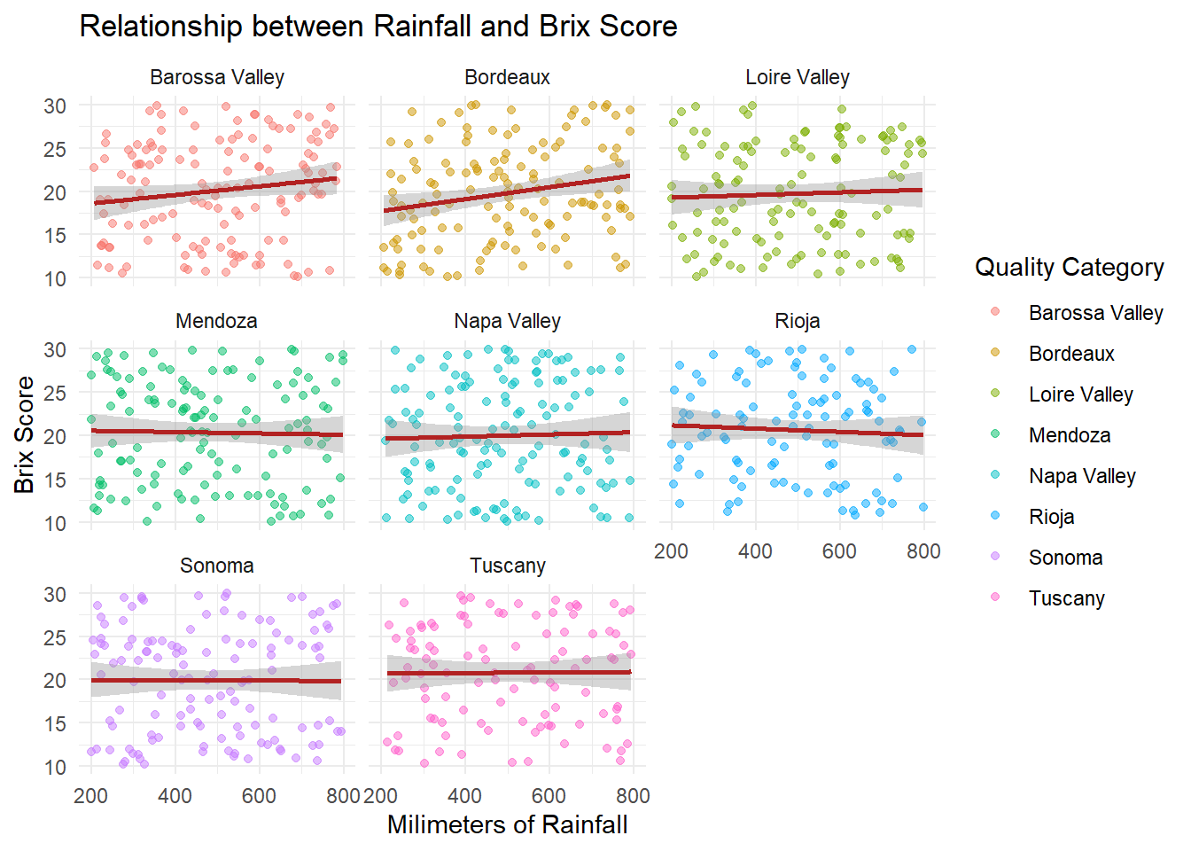 Based on this, this phenomena provides context for the long-term effects of climate change on wine development, feasibility and marketing. To explore this, this analysis will explore the effects of environmental qualities, variety type and region on grape quality and Brix. Brix degrees is a measure of the dissolved solids, primarily sugar, in a liquid and acts as a reference to the quality of the grape.