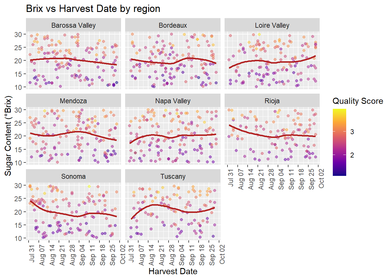 x = "Harvest Date", y = "Sugar Content (°Brix)",