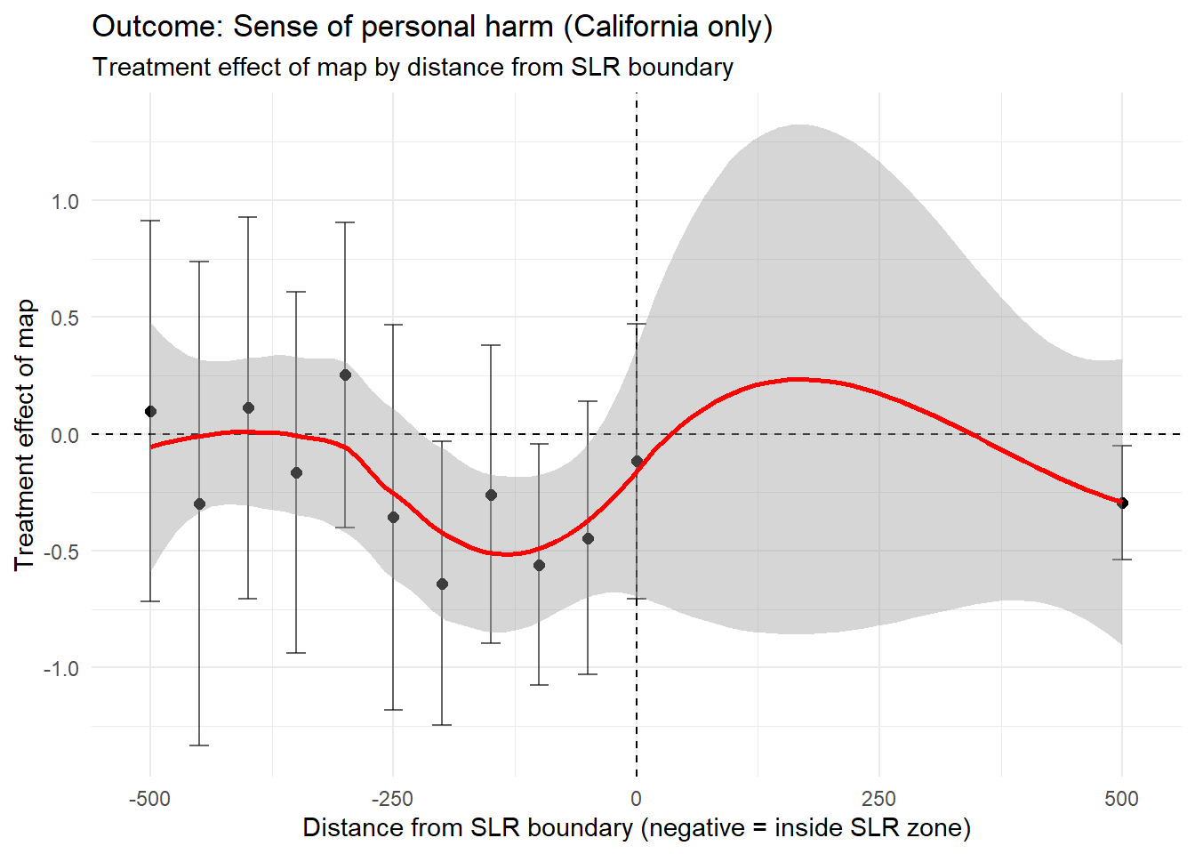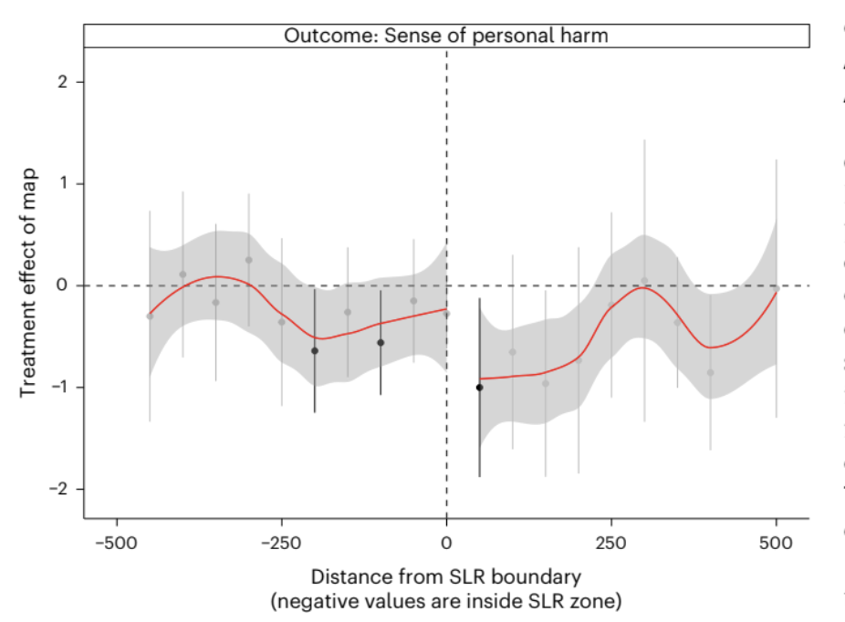There is no sharp change at the SLR boundary. If maps increased personal relevance, we would expect a spike near 0 meters. Instead, the curve is flat and negative.